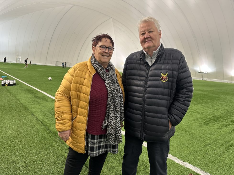 Nya tränaren Tor-Arne Fredheim kommer fram och hälsar och pratar med Per-Ola och Barbro i den inomhushall som ÖFK tränar i som uppladdning inför matchen mot Oddevold i Uddevalla.